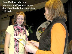 Frau Keilholz von der Havellandschule empfing am 12. März zehn Oberschüler aus Elstal, die vor den Schülern der Partnerschule ihre Zwischenrunde austragen werden. Allerdings sollten die Schüler der Partnerschule nicht nur zuhörendes Publikum sein, sondern auch ihr Votum abgeben über die Güte des Vorlesebeitrags in Form einer roten oder im positiven Fall einer grünen Karte.
